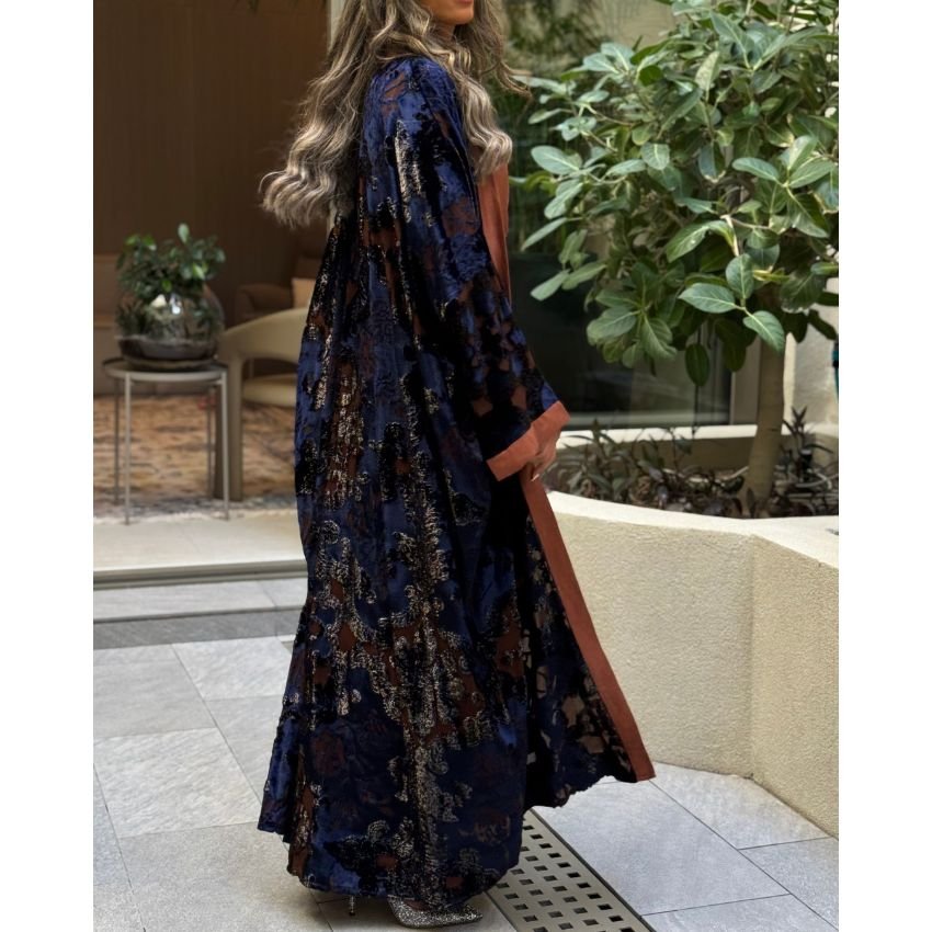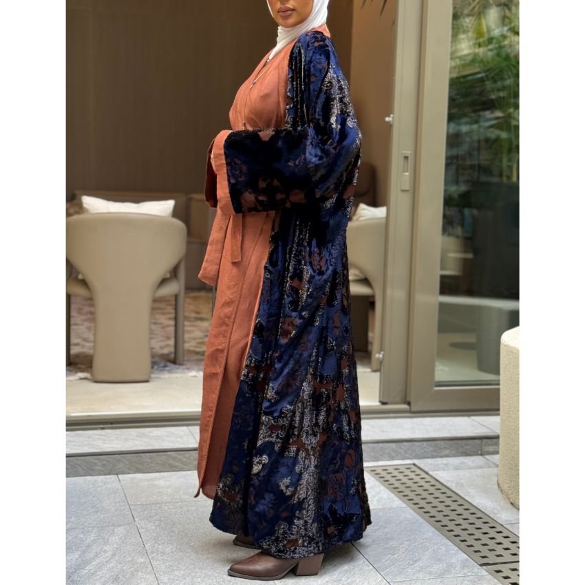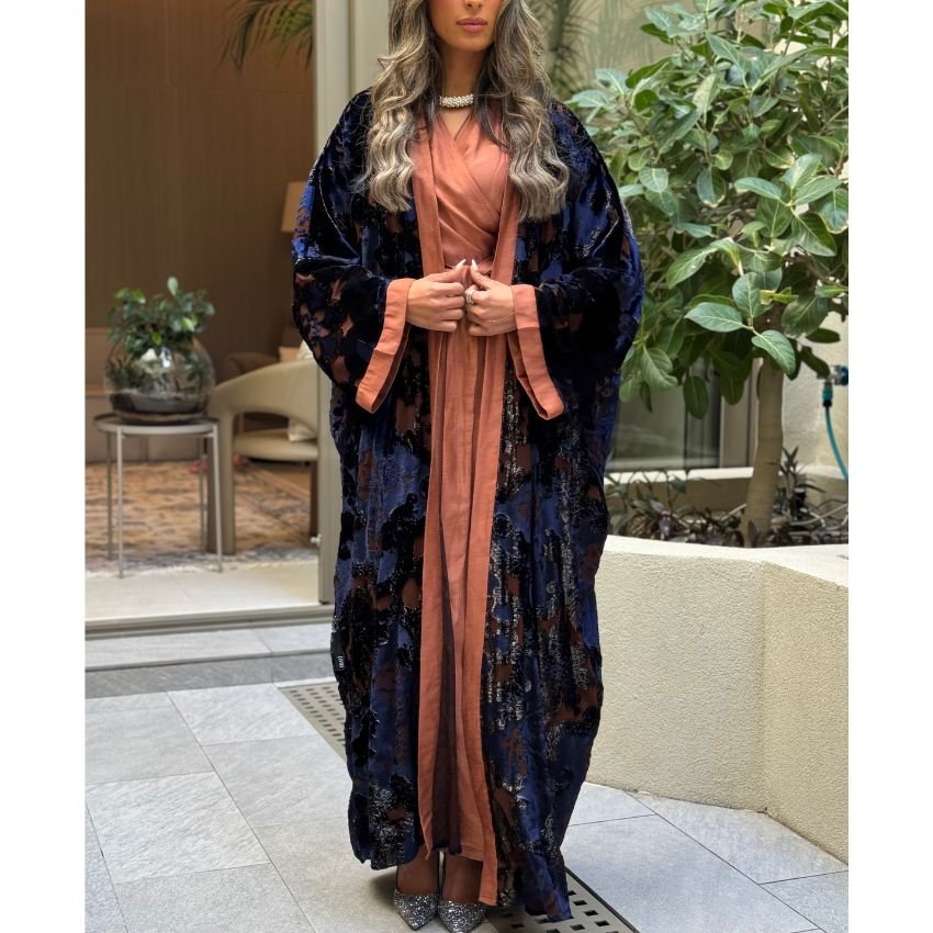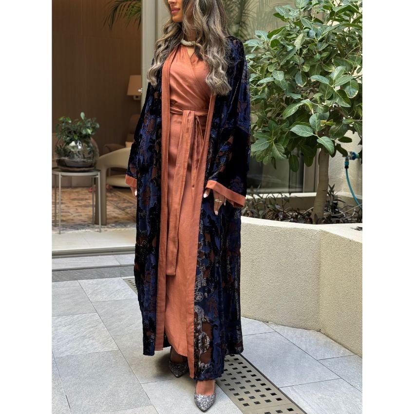 عباية من قطعتين؛ فستان داخلي من خامة اللنن مع حزام، وبشت من خام المخمل