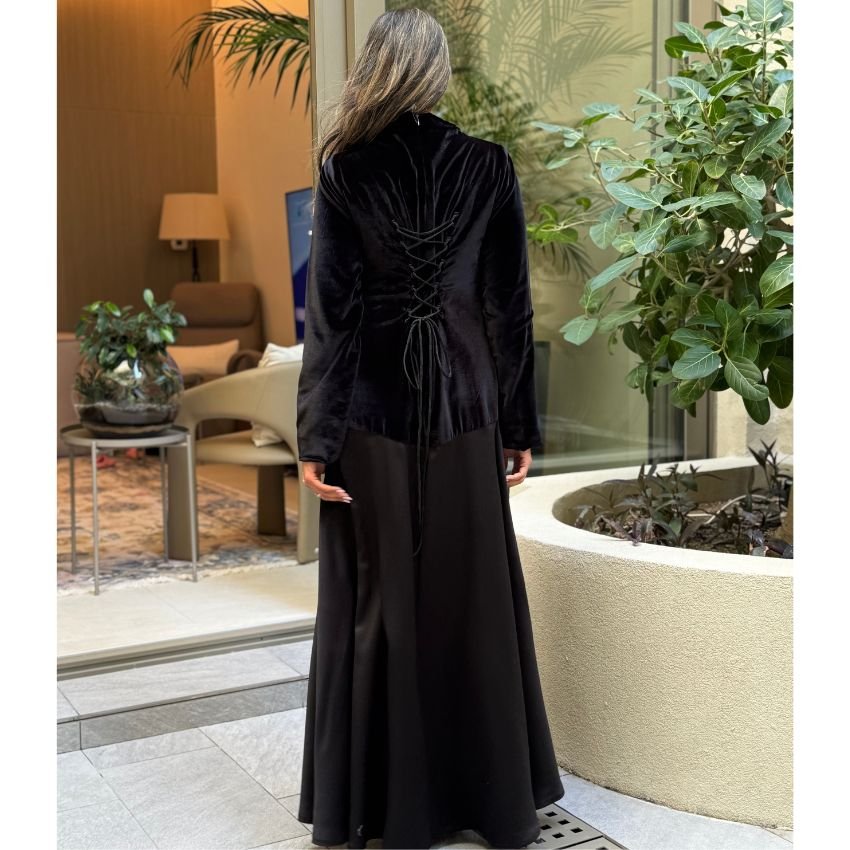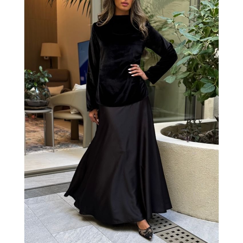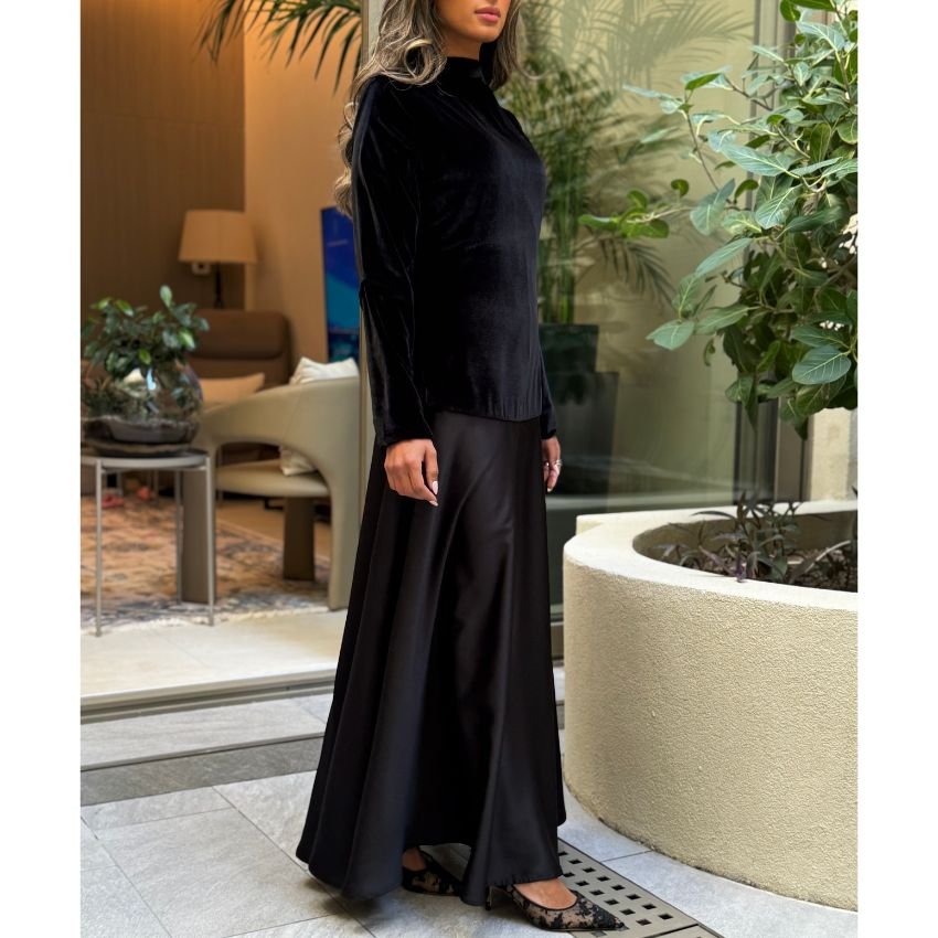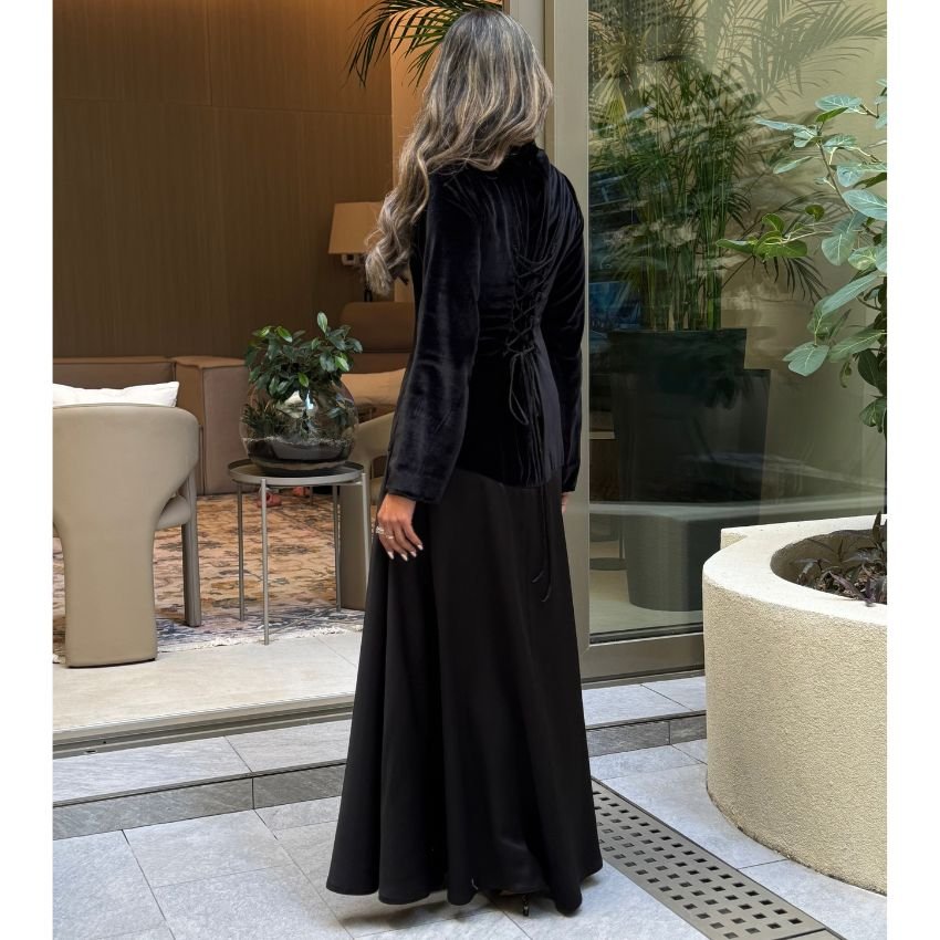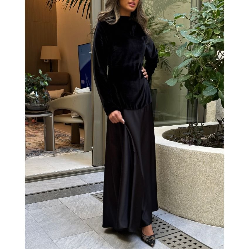 فستان أنيق بنصف مخمل ونصف ستان، يجمع بين الفخامة والنعومة