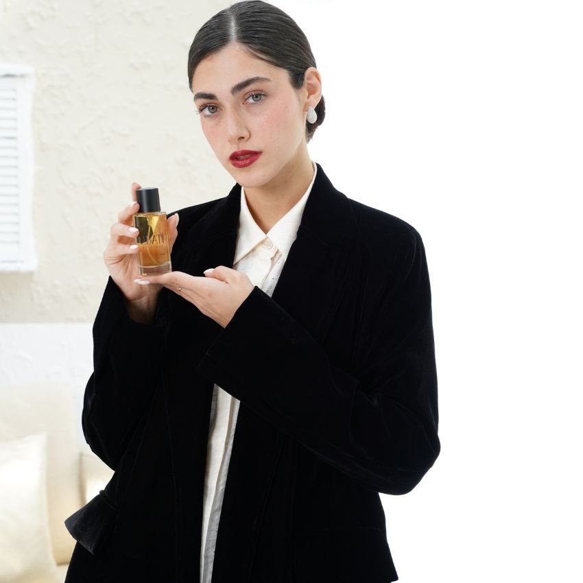 A luxurious abaya perfume 50ml bottle crafted with warm amber, rich sandalwood, and a hint of saffron. Non-staining & fabric-friendly, perfect for adding a touch of elegance to your abaya.