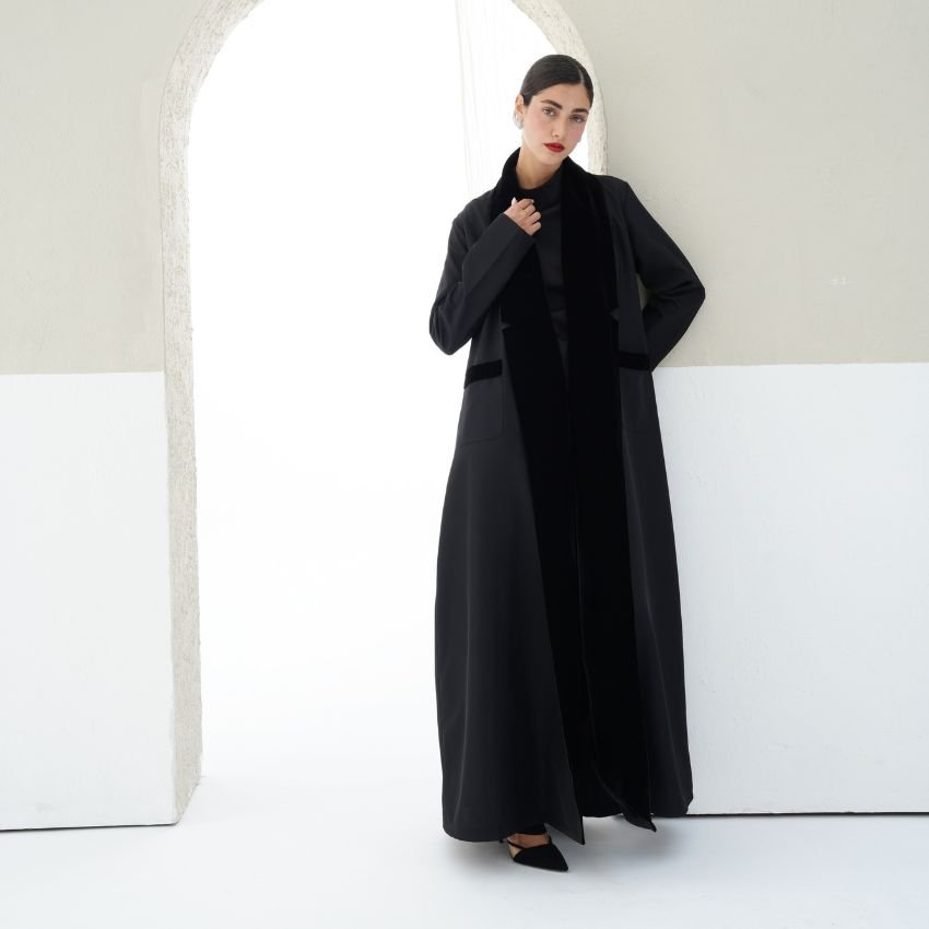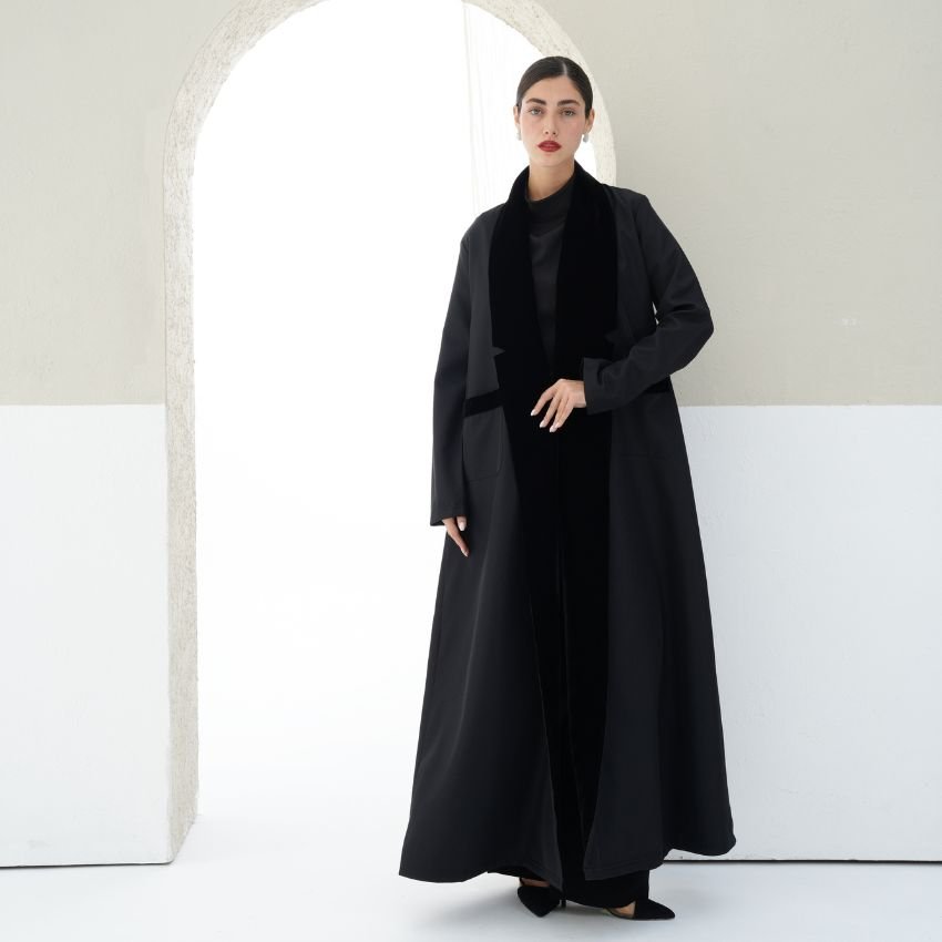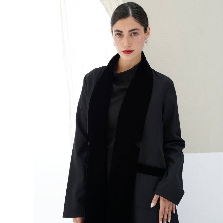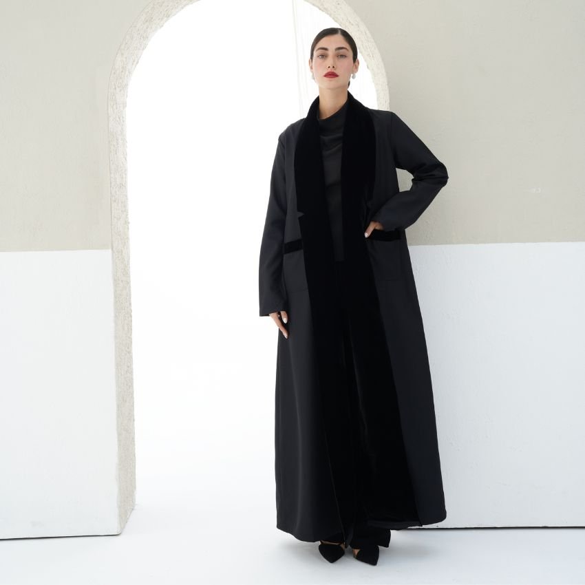 CREPE ABAYA WITH VELVET- DETAILED COLLAR AND POCKETS.