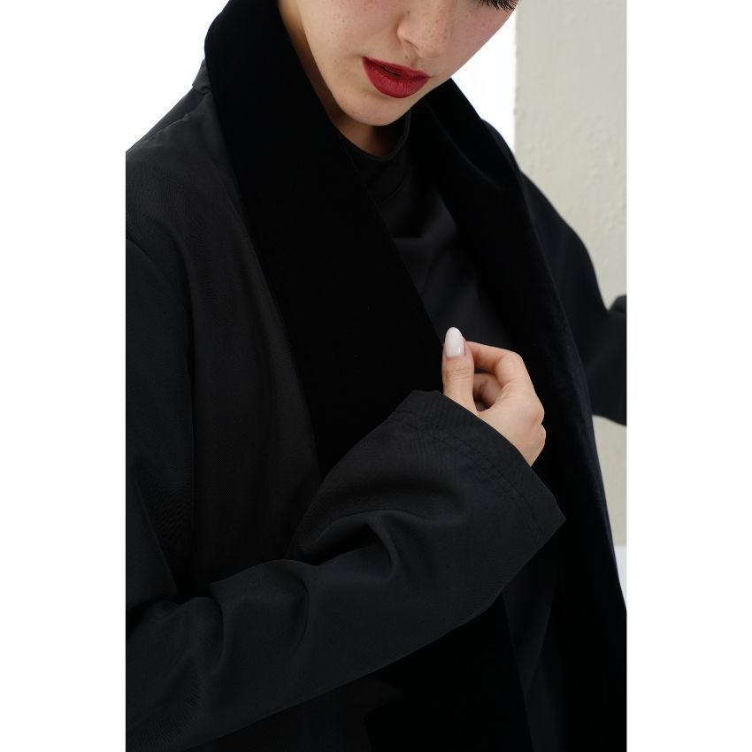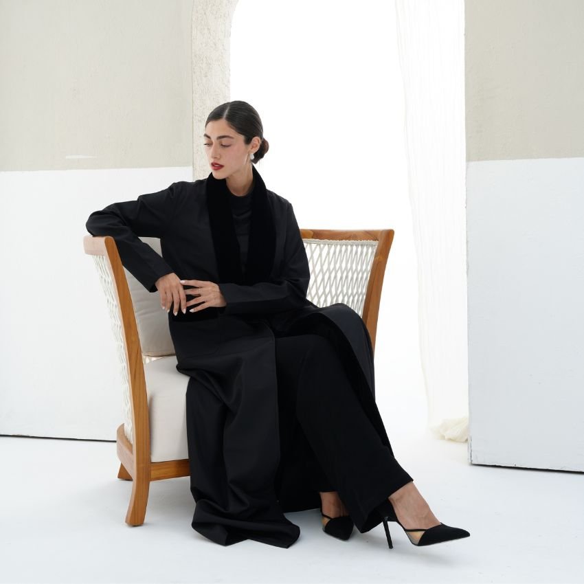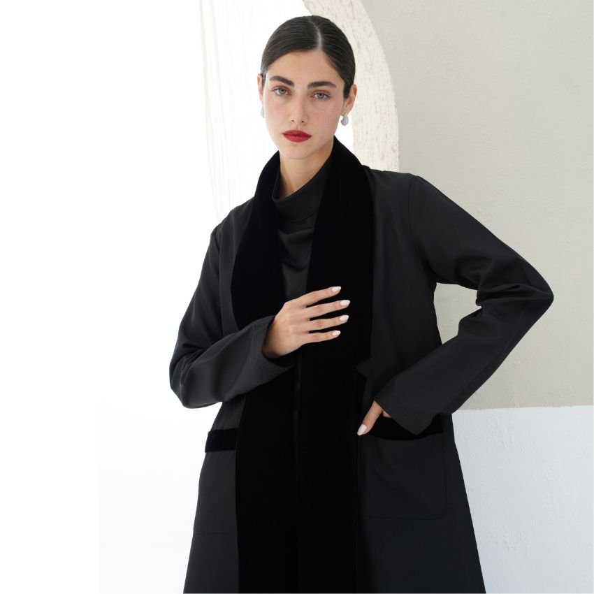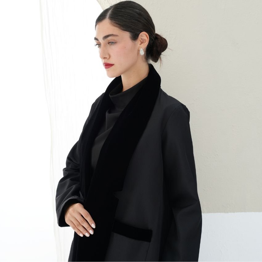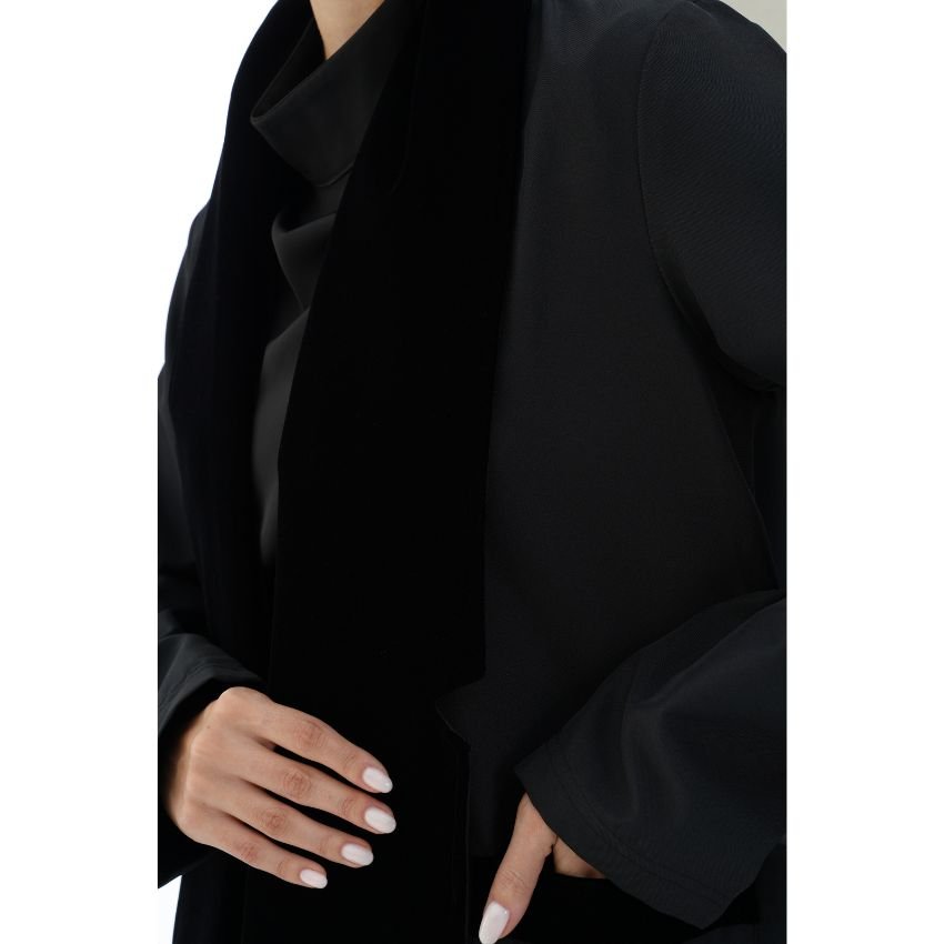 CREPE ABAYA WITH VELVET- DETAILED COLLAR AND POCKETS.