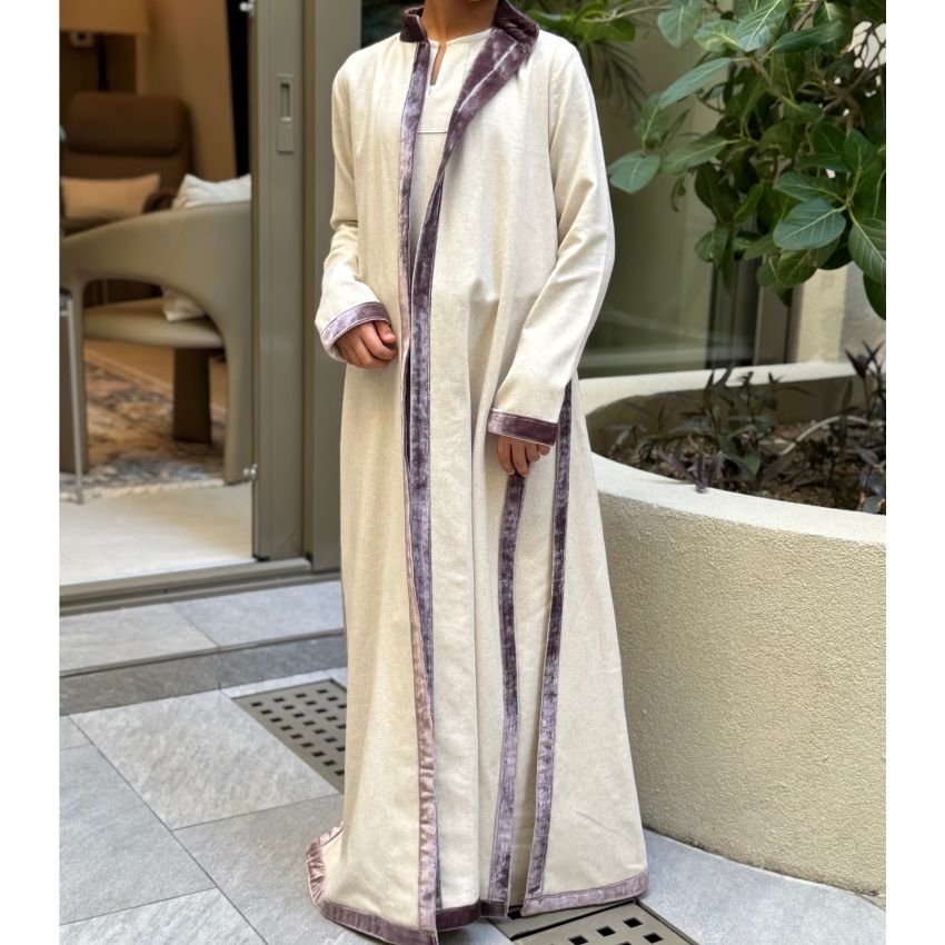 A two-piece daraa made of soft fabric with velvet edges and a belt.